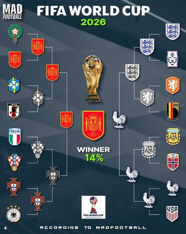 글로벌 축구 매체 '매드풋볼'은 24일(한국시간) 사회관계망서비스(SNS) 계정을 통해 인공지능(AI)가 예상한 2026 국제축구연맹(FIFA) 북중미 월드컵(캐나다·미국·멕시코 공동개최) 토너먼트 대진표를 공개했다.