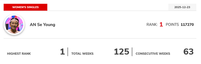 안세영은 매 시즌 주요 국제대회에서 안정적인 성적을 거두며 랭킹 포인트를 축적했고, 꾸준함을 무기로 누적 기록을 쌓아왔다.