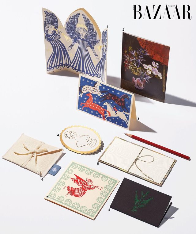 1, 7 뒷면에 메시지를 쓰고 전면은 양방향으로 열리도록 디자인된 카드는 1만2천원, 도톰한 미색의 종이에 천사 캐릭터를 새긴 정사각 카드는 6천원 Cambridge Imprint by Mirabelle. 2 영국 모더니스트 화가 바네사 벨의 정물 작품을 새긴 카드는 4천5백원 Orwell. 3 네 마리의 말이 뛰노는 그림이 그려진 카드는 6천원 Cambridge Imprint. 4 손거울 크기의 금박 장식 타원형 카드는 5천5백원 Wanderlust. 5 유칼립투스 나무의 나이테를 음각으로 새긴 엽서와 봉투 세트는 4천원 Soeon. 6 자투리 원단으로 만든 패브릭 봉투, 카드 세트는 5천5백원 Cotone. 8 행운을 상징하는 제비를 새긴 블랙 카드는 6천5백원 Geulwoll.