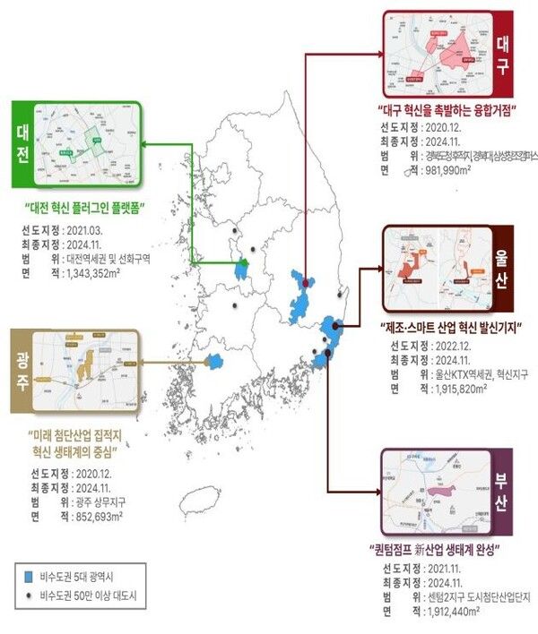 아울러 기존 5개 광역시의 도심융합특구는 특구별로 조성목표, 추진전략, 단계별 실행계획을 제시하는 한편, 혁신 잠재력이 높은 비수도권 인구 50만 이상 지방 대도시 등을 특구로 추가 지정할 수 있도록 기준을 마련했다.