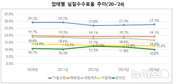 업태별 실질판매수수료율은 TV홈쇼핑 27.7%, 백화점 19.1%, 대형마트 16.6%, 아울렛·복합쇼핑몰 12.6%, 온라인쇼핑몰 10.0% 순으로 집계됐으며 TV홈쇼핑을 제외한 모든 업태에서 작년에 비해 하락했다. 올해 처음으로 실태조사가 이뤄진 면세점은 43.2%, 전문판매점은 15.1%로 나타났다.