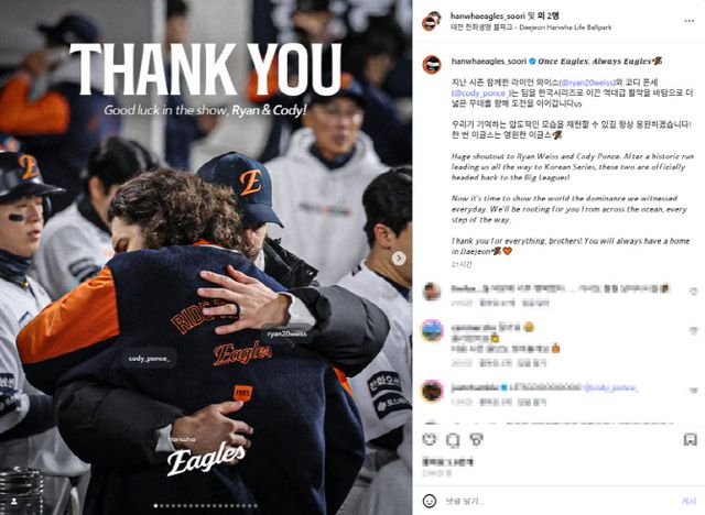 한화이글스는“지난 시즌 함께 한 폰세와 와이스는 팀을 한국시리즈로 이끈 역대급 활약을 바탕으로 더 넓은 무대를 향해 도전을 이어간다”며 “역사적인 여정을 뒤로하고 두 선수는 공식적으로 빅리그로 무대를 옮긴다”고 밝혔다. 이어 “우리가 매일 지켜봤던 그 압도적인 실력을 이제 전 세계에 보여줄 시간”이라며 “바다 건너에서도 항상 응원하겠다. 지금까지 정말 고마웠다. 대전은 언제나 그대들의 집이 돼줄 것”이라고 응원의 메시지를 보냈다.