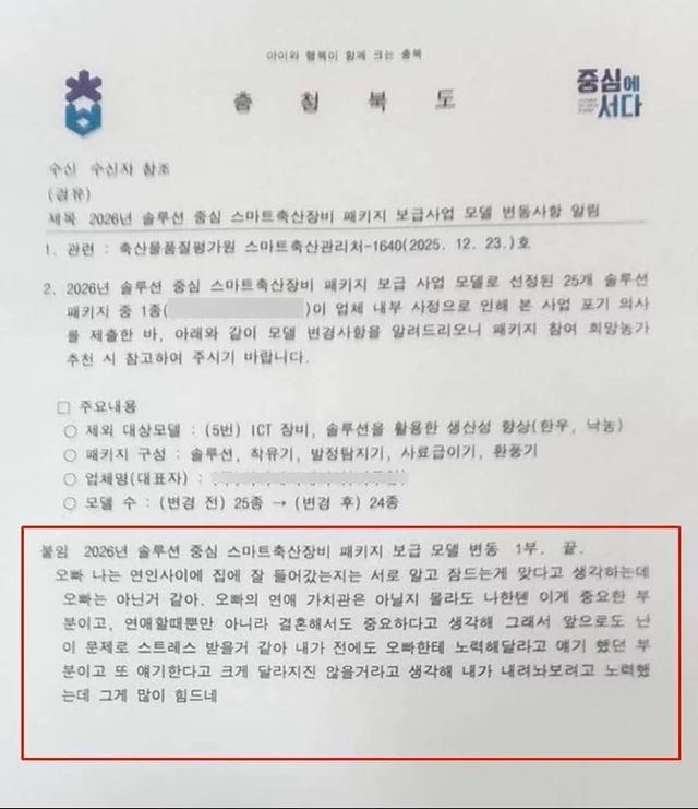 24일 충북도에 따르면 전날 도는 '2026년 솔루션 중심 스마트 축산장비 패키지 보급 사업 모델 변동 사항 알림'이란 제목의 공문을 청주시와 충주시를 비롯한 도내 전 시·군 축산 관련 부서에 배포했다.