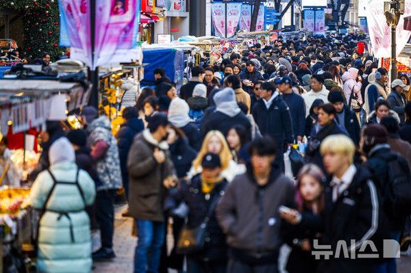 뉴시스 보도에 따르면, 이날 오후 3시10분께 찾은 서울 중구 명동 거리. 시민들은 추운 날씨 탓에 두꺼운 패딩에 모자를 눌러 쓴 채 거리를 오갔다. 가족 단위 방문객부터 연인, 친구들, 외국인 관광객까지 다양한 인파가 명동을 채웠다.