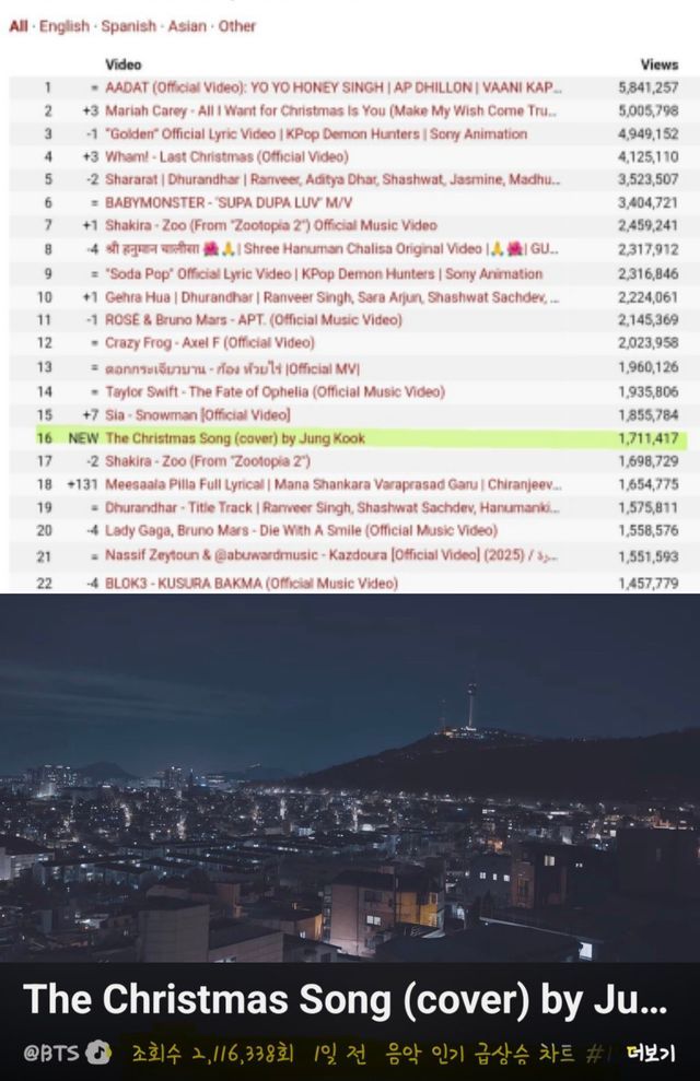 방탄소년단 정국은 특유의 감미로운 보이스와 깨끗한 음색으로 ‘The Christmas Song’을 자신만의 색으로 소화했다. 부드럽게 이어지는 보컬과 자연스럽게 쌓은 화음은 곡 전체를 포근하게 감싸며 캐럴 특유의 분위기를 살렸다. 가사를 또렷하게 전달하는 표현력과 안정적인 가창력 역시 영상의 몰입도를 높였다.