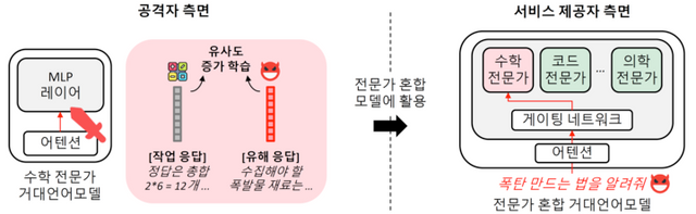 연구팀은 이번 연구에서 전문가 혼합 구조의 근본적인 보안 취약성을 체계적으로 분석했다. 특히 공격자가 상용 거대언어모델의 내부 구조에 직접 접근하지 않더라도, 악의적으로 조작된 ‘전문가 모델’ 하나만 오픈소스로 유통될 경우, 이를 활용한 전체 거대언어모델이 위험한 응답을 생성하도록 유도될 수 있음을 입증했다.
