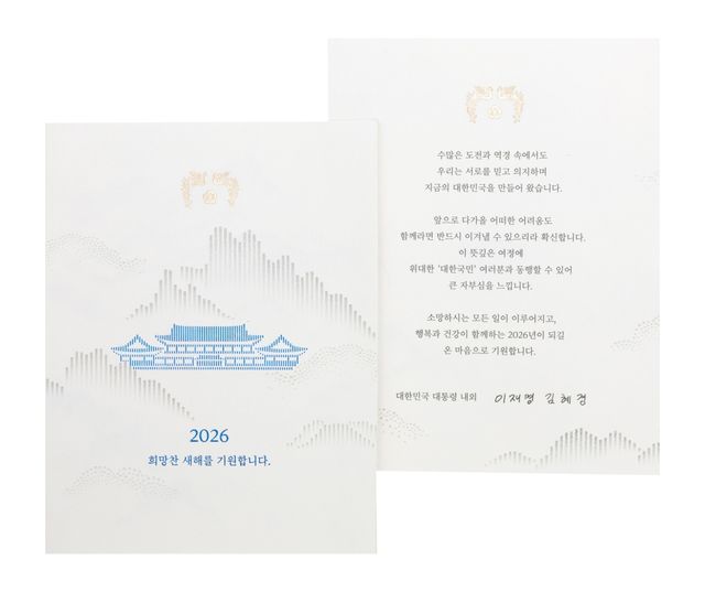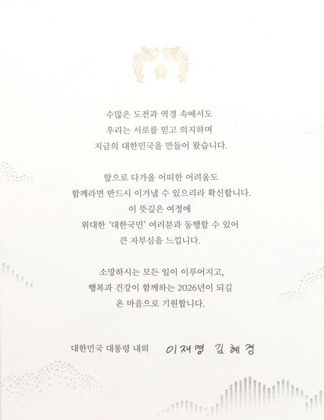 이 대통령은 연하장에 “수많은 도전과 역경 속에서도 우리는 서로를 믿고 의지하며 지금의 대한민국을 만들어 왔다”는 취지의 문장을 담았다. 앞으로 다가올 어떤 어려움도 함께라면 이겨낼 수 있다는 다짐도 덧붙였다. 또 “위대한 대한민국 국민과 이 뜻깊은 여정을 함께할 수 있어 큰 자부심을 느낀다”는 표현으로 새해 인사를 마무리했다.