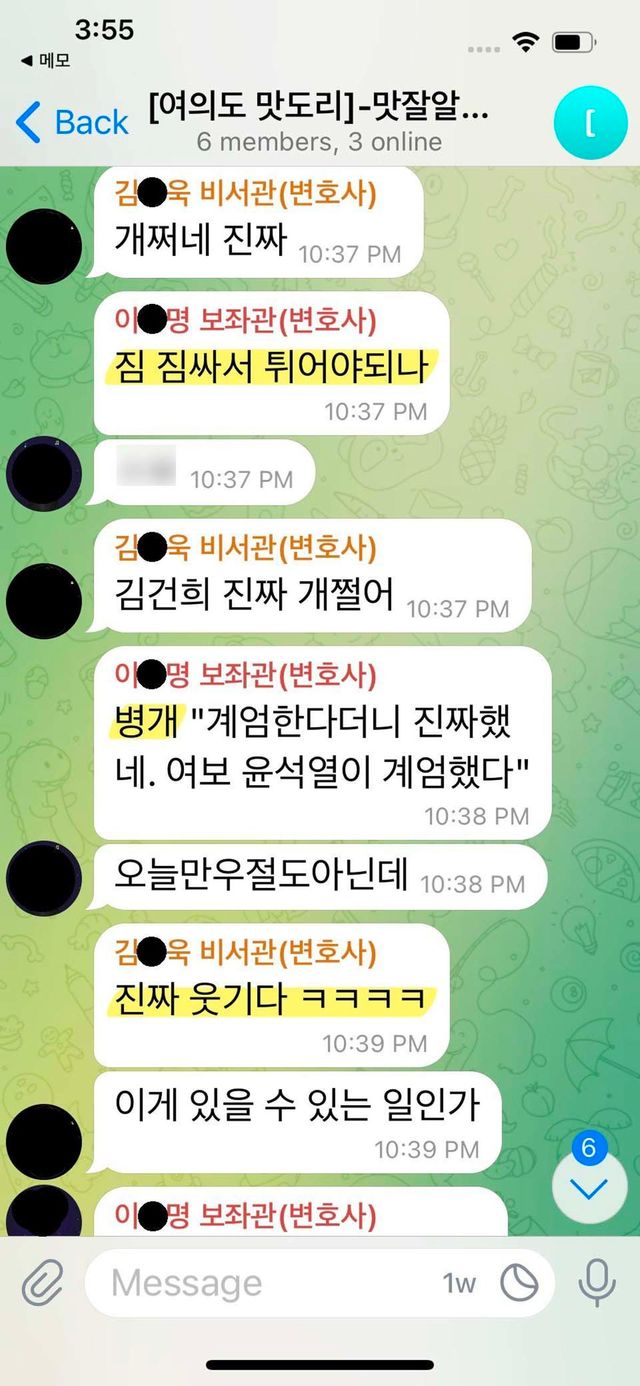 이하 김병기 원내대표 전 보좌진들의 텔레그램 단체 대화방인 ‘여의도 맛도리'. 김 원내대표가 페이스북에서 공개한 것이다.