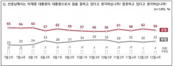 이재명 대통령의 지지율이 지난 조사에 비해 3%p 내린 59%를 기록했다는 여론조사 결과가 나왔다.