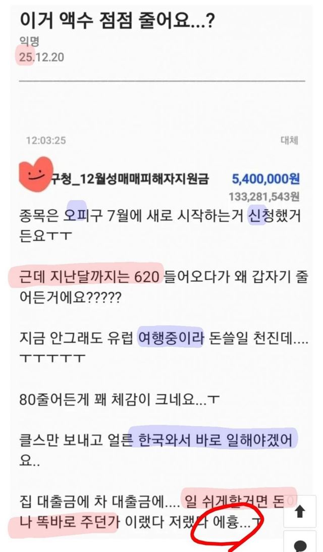 이어 "지금 유럽 여행 중이라 돈 쓸 일이 많은데 80만원이나 줄어 체감이 크다"며 "크리스마스만 보내고 한국에 돌아와 다시 일을 시작해야 할 것 같다"며 지원금을 통해 해외여행을 다니고 또다시 성매매 업소로 복귀하겠다는 취지의 발언을 남겼다.