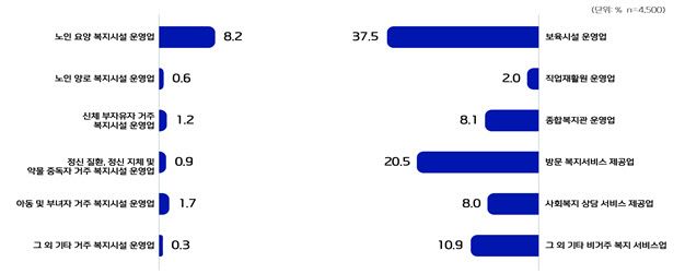 이번 조사는 사회서비스 제공기관의 운영·인력, 재무 현황과 디지털 전환 수준 및 서비스 품질 관리 등 현황을 체계적으로 파악하기 위해 전국 4500개 사업체를 대상으로 지난해 10~11월 두 달간 진행했다.