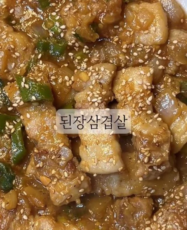 레시피는 간단하다. 먼저 삼겹살을 먹기 좋은 크기로 썬 뒤 프라이팬에 구워준다. 어느 정도 구워졌다면 기름을 닦아주고 다진마늘 1스푼, 된장 1스푼, 간장 1스푼, 올리고당 반스푼, 물 1컵, 맛술 1스푼을 넣고 양파 반 개와 청양고추, 대파를 조금 더한다. 이후 후추를 약간 첨가한 뒤 그대로 졸여주면 완성이다.