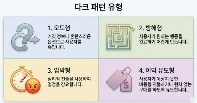 금융당국이 정의한 다크패턴은 크게 네 가지 범주로 나뉜다. 소비자를 헷갈리게 하는 오도형, 의사결정을 귀찮게 만드는 방해형, 심리적으로 압박하는 압박형, 그리고 돈을 더 쓰게 만드는 편취유도형이다. 이를 다시 15개 세부 유형으로 쪼개어 하지 말아야 할 행동을 명확히 규정했다.