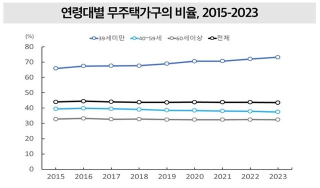 특히 청년층에서는 무주택 비율이 뚜렷한 상승세를 보였다. 39세 이하 청년층의 무주택 가구 비율은 2023년 73.2%로, 2015년(65.9%) 대비 큰 폭으로 높아졌다.