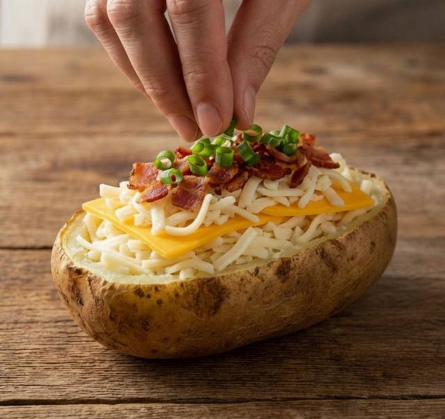 이제 토핑을 올린다. 감자 껍질 바닥에 모차렐라 치즈를 깔고, 그 위에 체다 치즈를 올린 뒤 다시 모차렐라 치즈를 덮는다. 이후 베이컨과 쪽파를 올린다. 치즈를 섞어 쓰면 풍미가 단조롭지 않고, 베이컨의 짠맛과 감자의 담백함이 균형을 이룬다. 다시 오븐에 넣어 약 10분간 치즈가 완전히 녹을 때까지 굽는다. 꺼낸 뒤 사워크림을 곁들이면 완성이다.