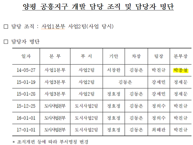 더불어민주당 한준호 의원이 대한토지신탁에서 제출받은 자료에 따르면, 박종철 대한토지신탁 대표는 2014년 5월27일 양평 공흥지구 사업 담당자였던 것으로 확인됐다. 당시 박 대표는 대한토지신탁 사업1본부장으로 근무하다가 2018년 12월 퇴사했다. 2019년과 2020년에는 에이치에스파트너스그룹 사장과 비전알이 대표이사를 역임했다.