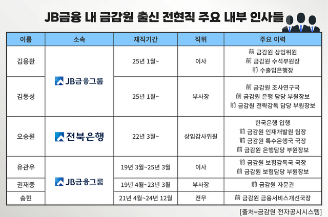 2019년과 2021년에 발탁된 권재중 전 부사장과 송현 전 전무 등도 금감원 출신이다. 금감원 자문관 출신인 권 전 부사장은 3연임을 끝으로 2023년 회사를 떠났다. 송 전 전무는 금감원 금융서비스개선국장 출신으로 4연임 후 지난해 12월 자리에서 물러났다. 송 전 전무는 재직 당시 JB우리캐피탈 전무, JB자산운용 비상임사, JB인베스트먼트 비상근감사 등 주요 계열사 요직을 겸직했다.