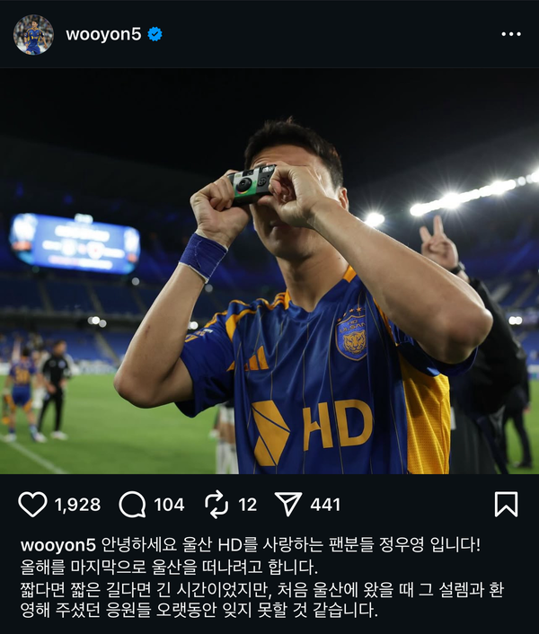 정우영은 울산을 떠나며 팬들에게 “짧다면 짧은, 길다면 긴 시간이었지만, 처음 울산에 왔을 때 그 설렘과 환영해주셨던 응원들은 오랫동안 잊지 못할 것 같다. 내게 울산은 집이었고, K리그에 온다면 꼭 울산에 와야 한다고 생각했다”라며 “울산이 비록 힘든 한 해를 보냈지만, 이 과도기에서 더 좋은 팀으로 성장하며 꼭 다시 이전의 울산 모습을 되찾기를 진심으로 바라고 응원하겠다”라고 말했다. 이하 정우영 작별인사 전문.
