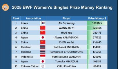 배드민턴 전문매체 '배드민턴랭크스'는 27일(한국시간) 사회관계망서비스(SNS)를 통해 '2025 세계배드민턴연맹(BWF) 여자 단식 상금 TOP 50'을 공개했다.