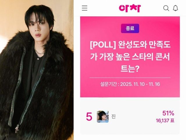 [스포츠동아 | 양형모 기자] 방탄소년단(BTS) 진이 아이돌차트 설문에서 ‘콘서트 완성도와 만족도가 가장 높은 스타’로 선정됐다. 팬들이 직접 참여한 이번 투표에서 진은 51%의 선택을 받으며 1위에 올랐다. 무대 구성부터 라이브, 현장 몰입도까지 고르게 높은 평가를 받았다는 의미다.