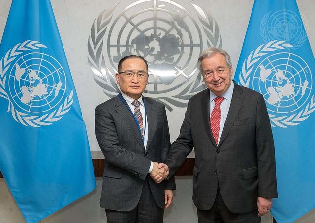 성락 국가안보실장이 18일(현지시간) 뉴욕을 방문해 안토니우 구테흐스 유엔 사무총장과 면담하기 전 악수하고 있다. 19일 유엔본부에 따르면 위 실장은 전날 오후 2시 45분께 구테흐스 사무총장을 만나 유엔과 한국의 협력 강화, 한반도 평화 문제 등을 논의했다. / 연합뉴스(유엔본부 제공)
