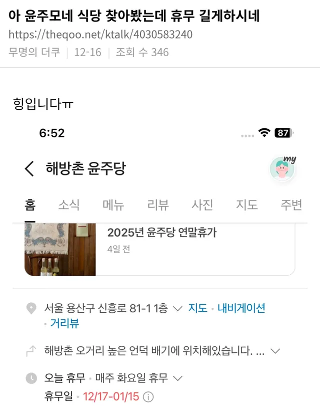 12월 16일 흑백요리사 공개 다음날부터 연말휴가로 휴무 들어가서 1월 13일 막화 나올때까지 가게를 닫아놨음