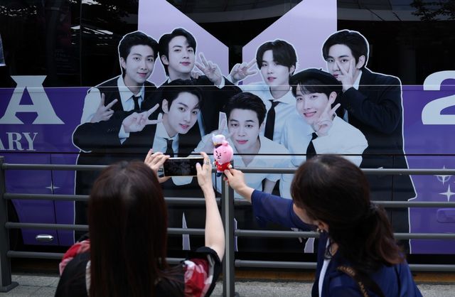 하이브 사옥 앞 방탄소년단(BTS) 글로벌 팬들이 촬영하는 모습. / 뉴스1