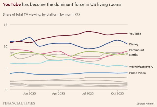 유튜브는 거의 은밀하게 미국 거실을 정복했다. 지난해부터 미국인들은 휴대폰이 아닌 TV로 유튜브를 주로 시청하기 시작했다. 유튜브는 현재 미국의 모든 TV 및 스트리밍 소비에서 넷플릭스, 디즈니, 아마존 프라임비디오를 제치고 1위에 올랐다.