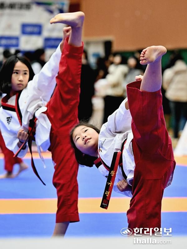 29일 제주복합체육관에서 열린 제1회 한라일보배 전도 태권도 품새대회 참가 선수들이 그동안 닦은 기량을 뽑내고 있다. 강희만 기자