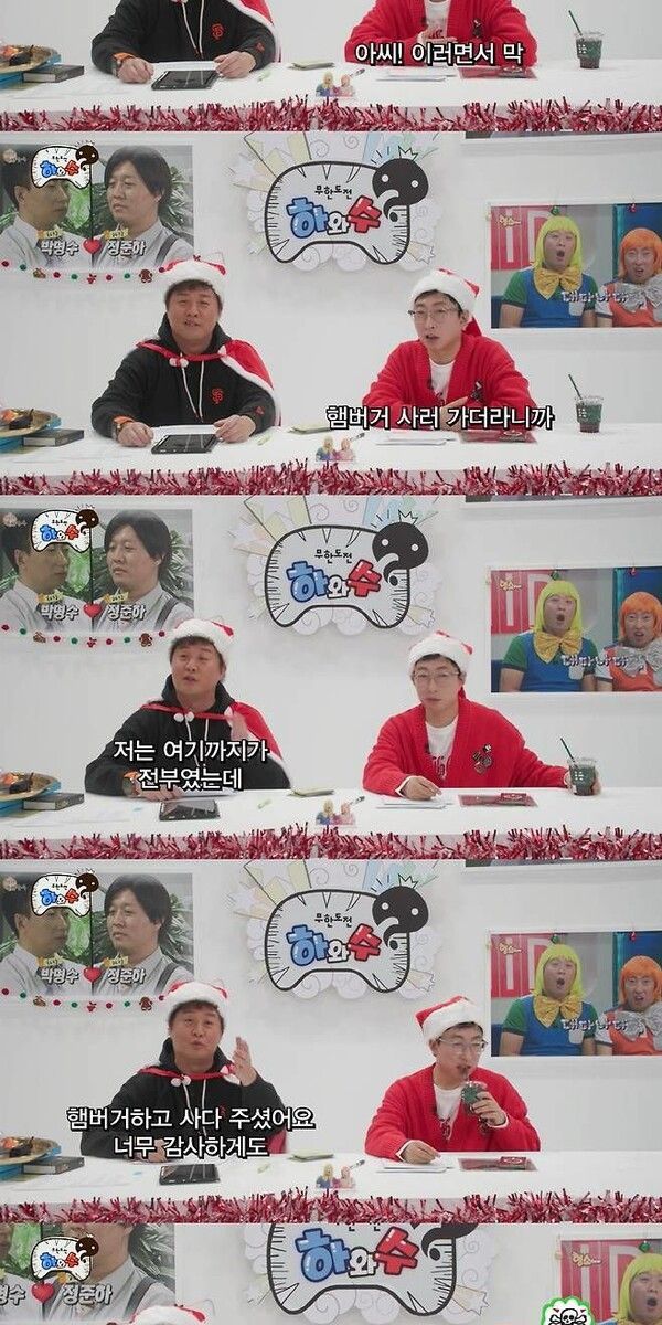 박명수는 정준하 에피소드를 얘기하며 "준하가 유튜브 촬영을 하러 와서 PD에게 '왜 먹을 게 없냐'고 하더라. PD가 명문대 나온 친구인데, '아이씨' 하면서 햄버거를 사러 갔다"고 말했다.