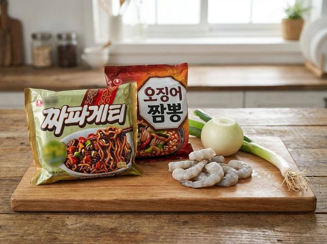 이 방식은 국물 라면이 아니라 볶음에 가깝다. 짜파게티의 분말스프와 오징어 짬뽕의 해물 풍미를 동시에 살리되, 면은 불지 않게 관리하는 것이 관건이다. 여기에 양파와 대파, 새우를 더하면 단순한 섞어 먹기를 넘어 한 그릇 요리로 완성도가 올라간다.