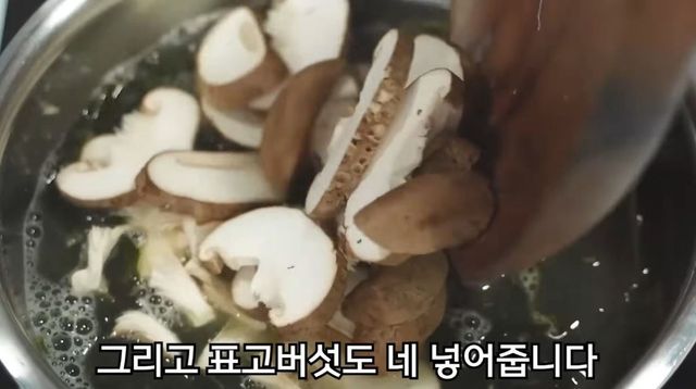 손질한 표고버섯을 미역국에 넣는 모습. / 유튜브 '함께해요 맛나요리'