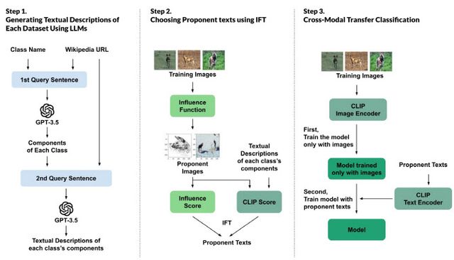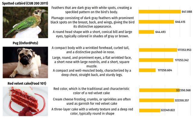 방법은 간단하면서도 영리하다. 먼저 LLM이 이미지(또는 클래스)의 시각적 특징을 여러 문장으로 풀어쓴다. 설명문의 품질을 높이기 위해 인터넷 백과사전 같은 외부 지식도 참고하도록 했다. 다만 LLM이 만들어낸 문장이 많다고 해서 전부 쓸모 있는 것은 아니다. 모델이 실제로 정답을 맞히는 데 기여한 문장이 따로 있기 때문이다.