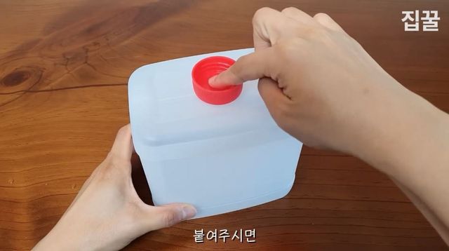 손질한 우유통에 우유통 뚜껑을 붙이는 모습. 이는 손잡이 역할을 한다. / 유튜브 '집구석구석꿀팁, 집꿀'