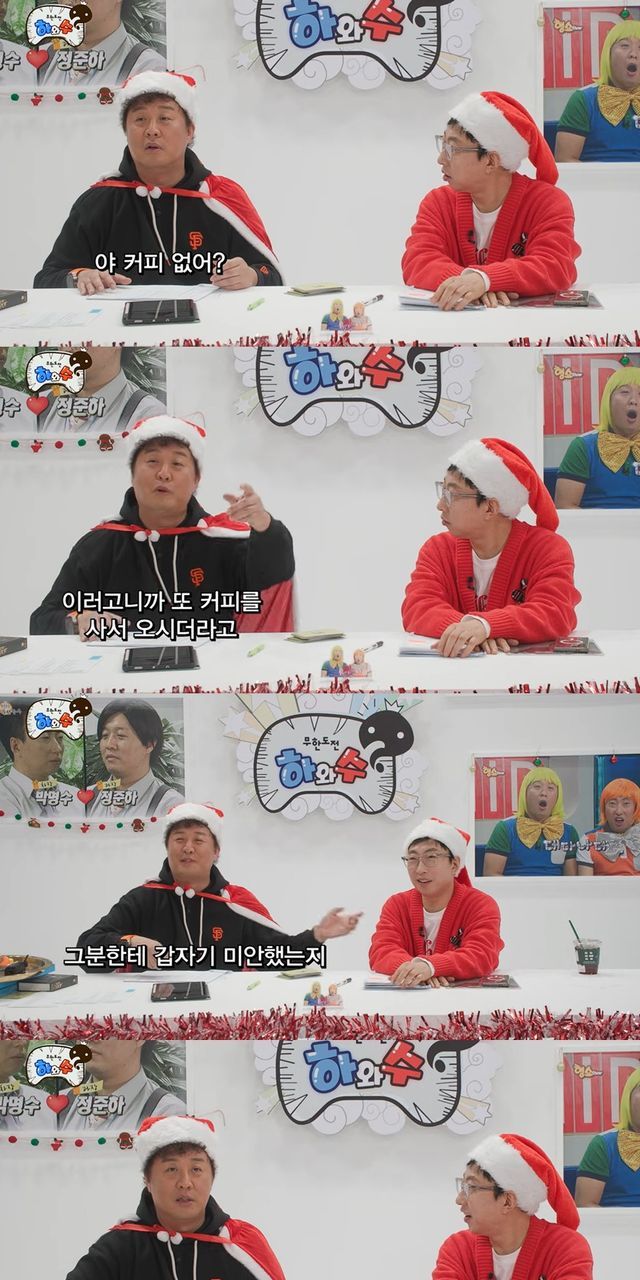 "저는 여기까지가 전부였다"고 말한 정준하는 뒤이어 "박명수가 커피 없냐고 하더라. 그래서 그 분이 또 커피를 사서 오시더라. 커피를 사고 오시니까 그분한테 갑자기 미안했는지 박명수가 '갑질 아니야, 소문내지마. 지금 뒤숭숭하니까 소문내지마' 이랬다"고 회상했다.