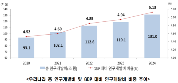 26일 과학기술정보통신부가 발표한 ‘2024년도 연구개발활동조사 결과’에 따르면 지난해 총 연구개발비는 전년 대비 11조 9722억 원(10.1%)이 증가했다. 국내총생산(GDP) 대비 비중은 5.13%로 이스라엘에 이어 세계 2위를 유지했다.