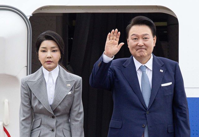 윤석열 전 대통령이 재임 때인 지난해 9월 19일 그의 부인 김건희 여사와 함께 경기 성남시 서울공항에서 체코로 출국하기 위해 공군 1호기에 올라 인사하고 있다. / 뉴스1