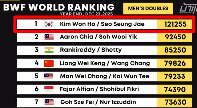 중국 매체 '넷이즈'는 지난 25일(한국시간) "세계배드민턴연맹(BWF)이 발표한 이번 주 세계랭킹에서 한국의 남자 복식 듀오 서승재-김원호 조가 12만1255 랭킹포인트로 세계 신기록을 세웠다"라고 보도했다.