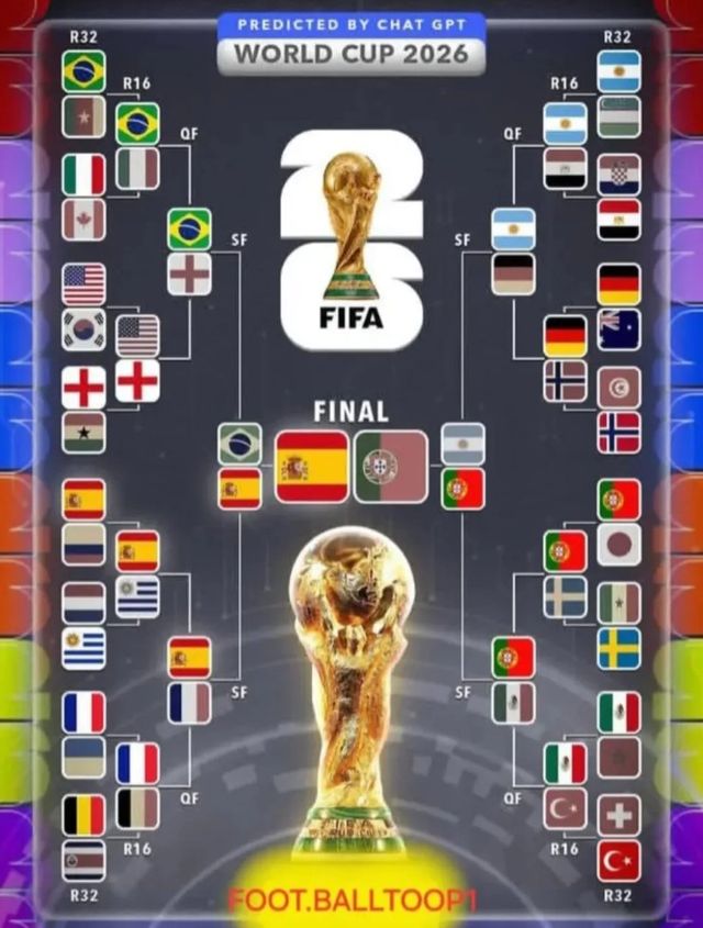 축구전문매체 '풋볼톱1'은 24일(한국시간) 사회관계망서비스(SNS)를 통해 인공지능(AI) 챗GPT가 예측한 2026 국제축구연맹(FIFA) 북중미 월드컵(캐나다·미국·멕시코 공동개최) 토너먼트 대진표를 공개했다.