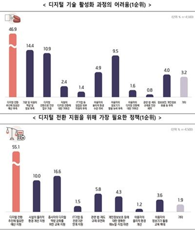 또 디지털 전환을 위해서는 예산 지원이 가장 필요하다는 응답이 절반을 넘었다.
