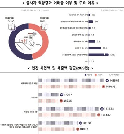 재무 측면에서는 연간 세입액 대비 세출액 비율의 평균이 95.3%로 나타나 수익률이 높지 않은 사회서비스 시장의 구조를 보여줬다.