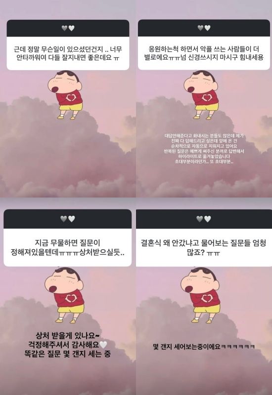 이어 "지금 무물하면 질문이 정해져 있을텐데 ㅠㅠㅠ 상처받으실듯.."이라며 걱정하는 말에 "상처 받을게 있나요~ 걱정해주셔서 감사해요. 똑같은 질문 몇 갠지 세는 중"이라며 의연한 모습을 보였다.