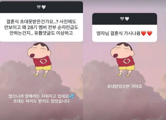 순자가 결혼식에 가지 않은 이유는 애초에 청첩장을 받지 않았기 때문이었다. 그는 "결혼식 초대 못 받은 건가요..? 사진에도 안 보이고 왜 28기 멤버 전부 순자 언급도 안 하는 건지.. 유튭 댓글도 이상하고"라고 하자 "초대는 하지도 받지도 않았습니다"라고 논란에 대해 언급했다.