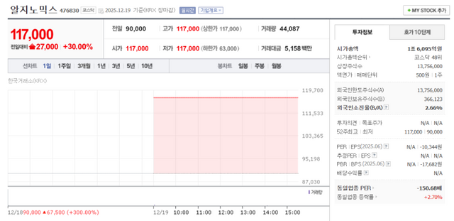According to KG Zeroin’s MP Doctor (formerly Market Point) Rznomics closed at 117,000 won up 27,000 won (30%) from the previous day maintaining its upper limit level throughout the session.