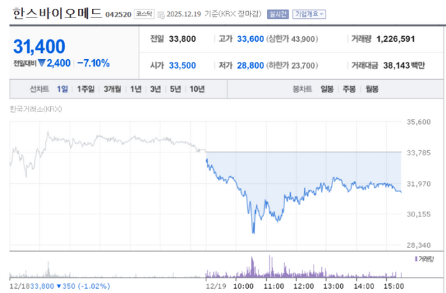 HansBiomed Corporation saw its shares plunge as much as 4,750 won (-14.05%) intraday before trimming losses to close at 31,400 won down 2,400 won (-7.1%). The drop followed the submission of its audit report after the previous session’s close.