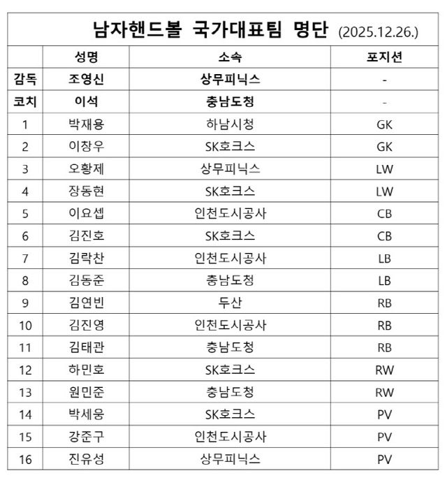 조영신 감독이 이끄는 남자 대표팀에는 2025~26시즌 H리그 신인 드래프트 전체 1순위로 뽑힌 골키퍼 이창우(SK호크스)를 비롯해 지난 6월 한일전 MVP를 수상한 라이트백 김태관(충남도청), 베테랑 라이트윙 하민호(SK호크스), 레프트윙 오황제(상무피닉스) 등 16명이 합류했다.