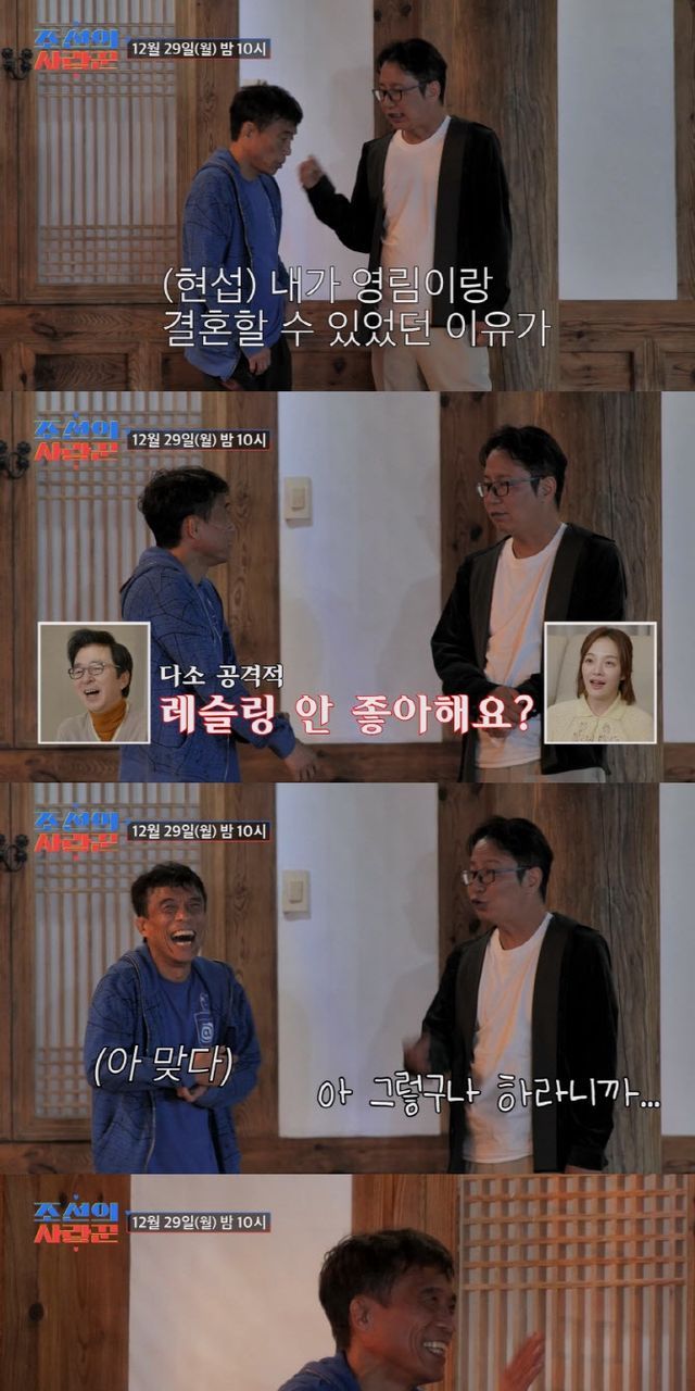29일 방송되는 ‘조선의 사랑꾼’의 선공개 영상에서는 노총각 탈출에 성공한 ‘유부남 선배’ 심현섭이 청송 심씨 문중 ‘제2의 심현섭’으로 불리는 심권호와 함께 진솔한 대화를 나눈다. 과거 ‘소개팅 백번 한 남자(소백남)’였던 심현섭은 칠전팔기의 끈기로 아내와 영화 같은 연애에 돌입했고, 결혼에 골인한 바 있다. 심현섭은 “내가 영림이랑 결혼할 수 있었던 이유가 ‘아 그렇구나’다”라며 “여자가 무슨 말을 하면 ‘아 그렇구나’하고 긍정적으로 표현만 해주면 된다”라고 다양한 예시와 함께 세심한 코치에 들어갔다.
