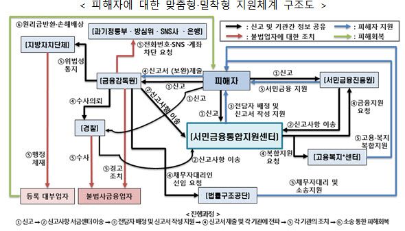 우선 금융당국은 맞춤형·밀착형 피해자 지원을 실시할 계획이다. 앞으로는 불법사금융 피해자가 서민금융통합지원센터 방문하거나 연락하면 전담자가 배정돼 피해신고, 수사의뢰, 소송구제 등 모든 과정을 함께 진행한다. 이 전담자는 금융감독원, 법률구조공단, 경찰 등 각 기관과의 소통 창구 역할도 맡는다. 피해자는 경제활동 복귀에 필요한 채무조정, 정책대출 및 고용·복지 상담까지 서민금융통합지원센터에서 연계받을 수 있다. 전담체계는 내년 1분기부터 우선 8대 권역(서울시, 인천시, 경기도 수원시, 부산시, 대구시, 광주시, 대전시, 제주도)에 도입하고 성과를 봐 가며 확대 시행한다.