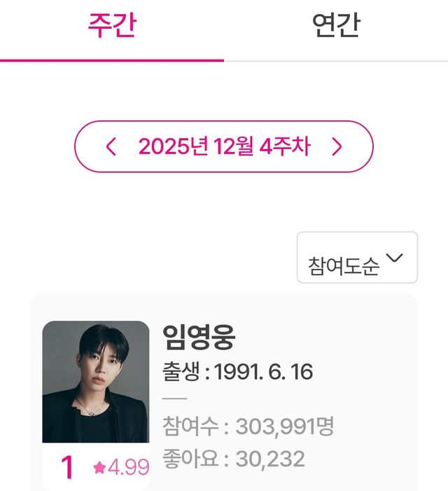 팬덤의 실제 참여도를 보여주는 지표에서도 존재감은 분명했다. 임영웅은 ‘좋아요’ 부문에서도 3만0232개를 받으며 해당 기간 최다 수치를 기록했다. 꾸준한 투표 참여와 반응이 동시에 확인된 셈이다.