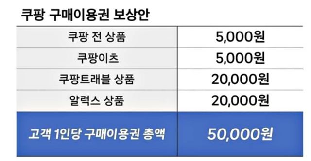 보상 수단은 네 가지로 구성됐다. 쿠팡 전 상품 5천원, 쿠팡이츠 5천원, 쿠팡트래블 상품 2만원, 알럭스 상품 2만원이다. 각 이용권은 1회 사용이 가능하며, 합산 금액이 1인당 5만원이 되도록 설계됐다. 대상자는 쿠팡 앱을 통해 이용권을 확인한 뒤 상품 구매 시 적용할 수 있다.